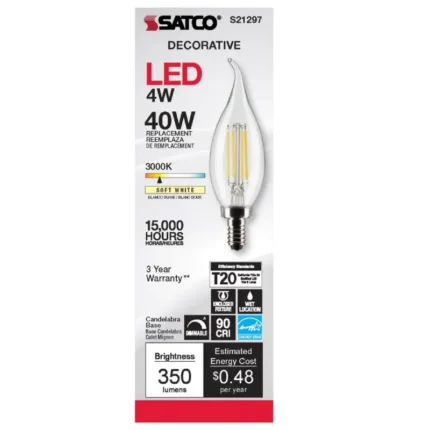 Satco S21264 4 Watt B11 LED; Clear; Candelabra base; 90 CRI; 2700K; 120 Volt