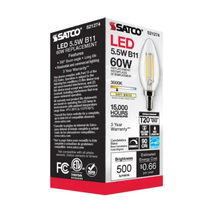 Satco S21274 5.5 Watt B11 LED; Clear; Candelabra base; 90 CRI; 3000K; 120 Volt