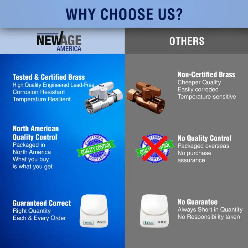 - [Global Approvals] Every Stop Valve and Faucet Water Shut Off from New Age America meets rigorous standards, certified and listed under NSF/ANSI, ASSE 1061, NSF-372, NSF-14, UPC, cUPC. Manufactured in an ISO-rated facility, these valves are made with Lead-Free Brass, ensuring safe potable water distribution. Their comprehensive certifications guarantee that each Stop Valve and Faucet Water Shut Off aligns with the highest industry requirements for quality and safety