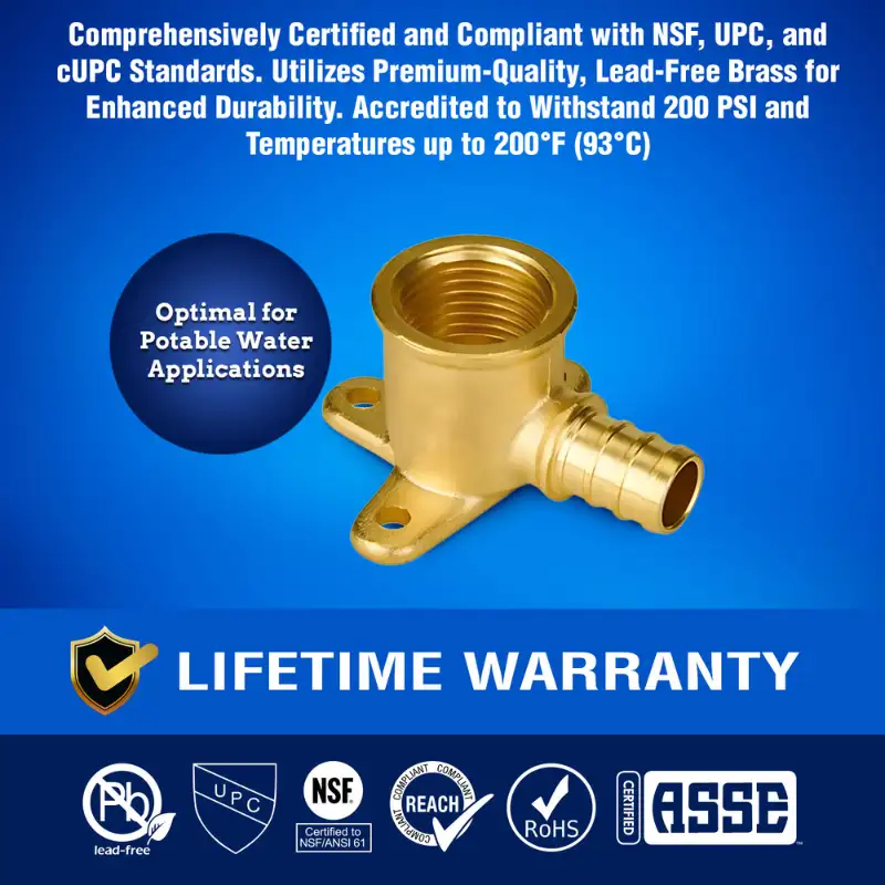 - [Global Approvals] Every PEX Drop Ear Elbow Fitting from New Age America meets Rigorous Standards, certified and listed under NSF/ANSI, UPC, cUPC, and ASTM F1807. Manufactured in an ISO-rated facility, these Plumbing Fittings are made with Lead-Free Brass, ensuring Safe Potable Water Distribution. Their Comprehensive Certifications guarantee that each Drop Ear Elbow aligns with the Highest Industry Requirements for Quality and Safety in PEX Crimp applications