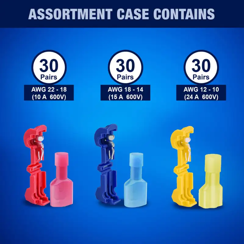 - [Comprehensive Wire Connectors Kit] New Age America's T-Tap Wire Connectors Provide a Perfect Fit for Various Wire Sizes. Each Connector in Our Wire Connectors Kit, Including Quick Splice Disconnects, Wire Taps, and Self-Stripping Quick Splices, Is Designed for Precise and Secure Connections. This Assortment Includes 30 Pairs of AWG 22-18, 30 Pairs of AWG 18-14, and 30 Pairs of AWG 12-10. Rated to 600 Volts and 24 Amps, These Wire Splice Connectors Ensure Reliable Performance for All Installs