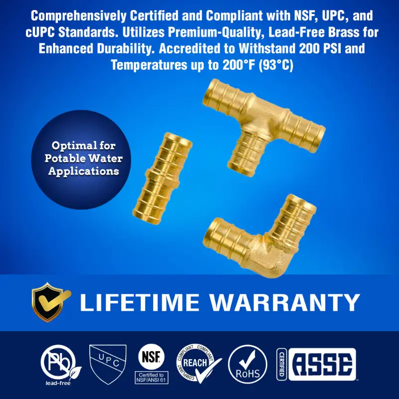 - [Global Approvals] Every PEX Crimp Fitting from New Age America, including Elbows, Tees, and Couplings, meets Rigorous Standards, certified under NSF/ANSI, ASSE 1061, NSF-372, NSF-14, UPC, and cUPC. Manufactured in an ISO-rated facility, these Plumbing Fittings are made with Lead-Free Brass, ensuring Safe Potable Water Distribution. Their Certifications guarantee that each PEX Fitting aligns with the Highest Industry Requirements for Quality and Safety. Designed as Barb PEX Fittings for PEX