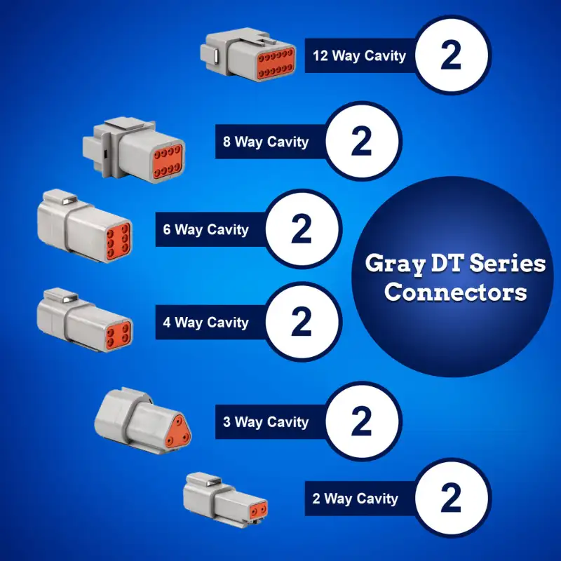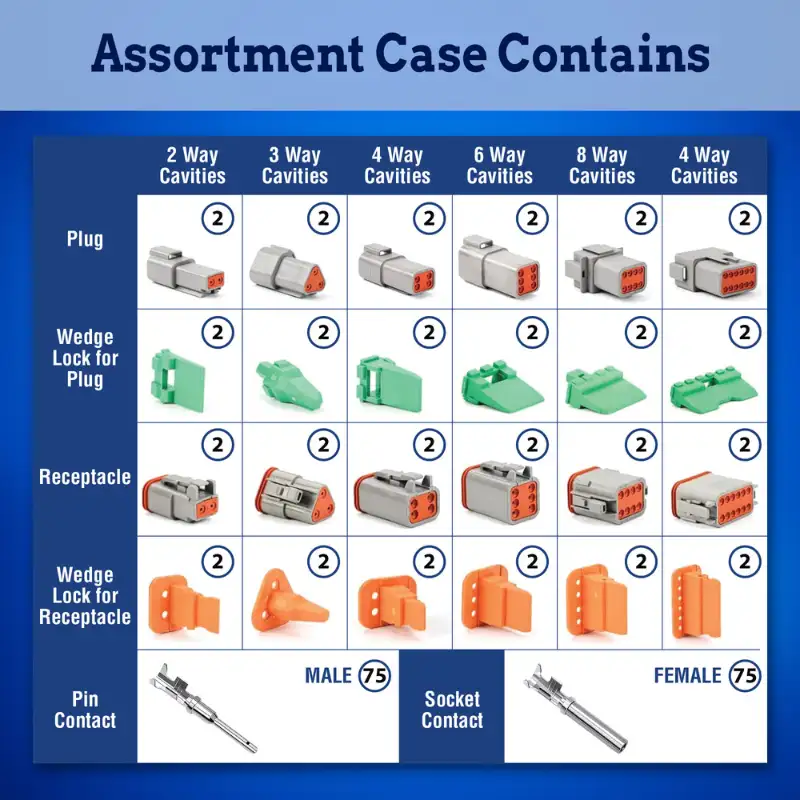 - [Deutsch Equivalent DT Series] This Set Comprises 2 Sets Each of 2-Pin, 3-Pin, 4-Pin, 6-Pin, 8-Pin, and 12-Pin Connectors, Along with 75 Pairs of DT Pins and Sockets. Crafted with Waterproof Materials, These Deutsch Equivalent DT Series Automotive Electrical Connectors Feature Tin-Plated Copper for Optimal Current Flow and PA66 Grade Nylon Housing for Durability. Ideal for a Wide Range of Automotive Applications, These Connectors Ensure Reliable Electrical Connections in Various Environments