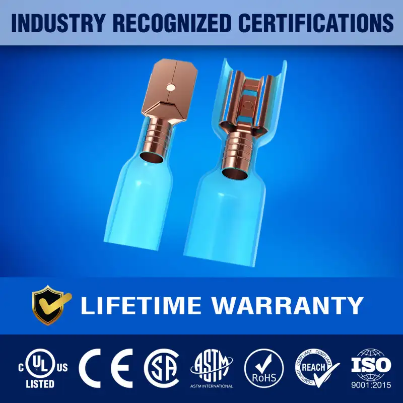 - [Global Approvals] Every Heat Shrink Spade Connector from New Age America, Included in Our Wire Connectors Kit and Known as Male and Female Quick Disconnect Terminals or Crimp Connectors, Meets Rigorous Standards. Certified and Listed Under UL, cUL, CE, REACH, RoHS, Certified to ASTM Standards, and Manufactured in an ISO-Rated Facility, These Wire Connectors Are Made with High-Quality Tin Plated Copper. Their Comprehensive Certifications Guarantee Industry Requirements for Quality and Safety