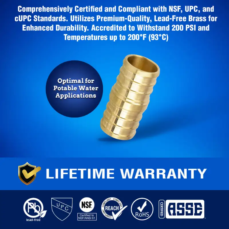 New Age America’s PEX Crimp Fittings, 25 Pcs, 1/2 Inch Couplings, Feature AquaFlow 360™ Technology and Are Made from Lead-Free Brass for Potable Water Applications. These Coupling Withstand Temperatures from 32℉ to 200℉ (0℃ to 93℃) and a Maximum Pressure of 200 PSI. Certified NSF/ANSI, ASSE 1061, NSF-372, NSF-14, UPC, cUPC, and ASTM F1807. Manufactured in an ISO-Rated Facility, They Ensure High Quality and Safety Standards. Backed by a Lifetime Warranty for Durability and Performance.