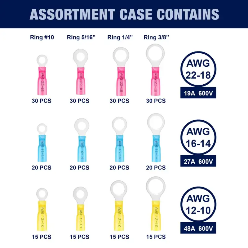 - [Comprehensive Wire Connectors Kit] New Age America's Heat Shrink Ring Connectors Provide a Perfect Fit for Various Wire Sizes. This Assortment Includes 30 pcs each of AWG 22-18 Ring #10, Ring 1/4", Ring 5/16", Ring 3/8"; 20 pcs each of AWG 16-14 Ring #10, Ring 1/4", Ring 5/16", Ring 3/8"; and 15 pcs each of AWG 12-10 Ring #10, Ring 1/4", Ring 5/16", Ring 3/8". Each Ring Wire Connector Kit, Including & Waterproof Wire Connectors, Is Designed for Precise Connections. Rated to 48 Amps & 600 Volts