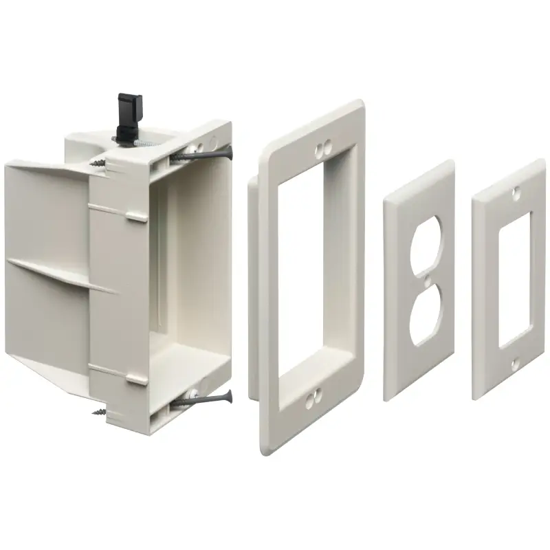 (1)Trim Plate (1)Single-Gang Wall Plate with screw(s) (1)Single-gang Recessed IN BOX® (1)Single-Gang Decorator-Style / GFCI Wall Plate with screws (1)NM94 Cable Connector (2)#8 x 3" Long Screws (2)#6-32 x 1/2" Long Screws |