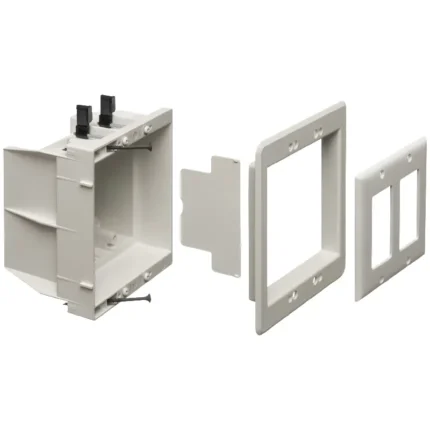 Arlington’s recessed non-metallic IN BOX™ for indoor use allows plasma and LCD TVs to mount flush against the wall. Great for furniture or countertop items like coffee makers or microwave ovens too! It’s available in one- or two-gang styles – in black and white – for power or low voltage applications in new construction or old work. Using the supplied separator with the two-gang style allows you to install one power and one low-voltage device in the box