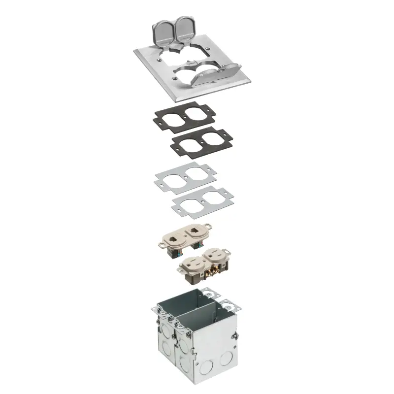Combo Floor Box Kit with Installed Low Voltage Divider. A combination floor box kit with installed low voltage divider. Includes four flip lids and gasket, One duplex receptacle and one low voltage duplex plate. Nickel.