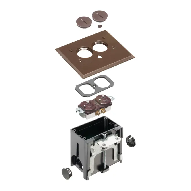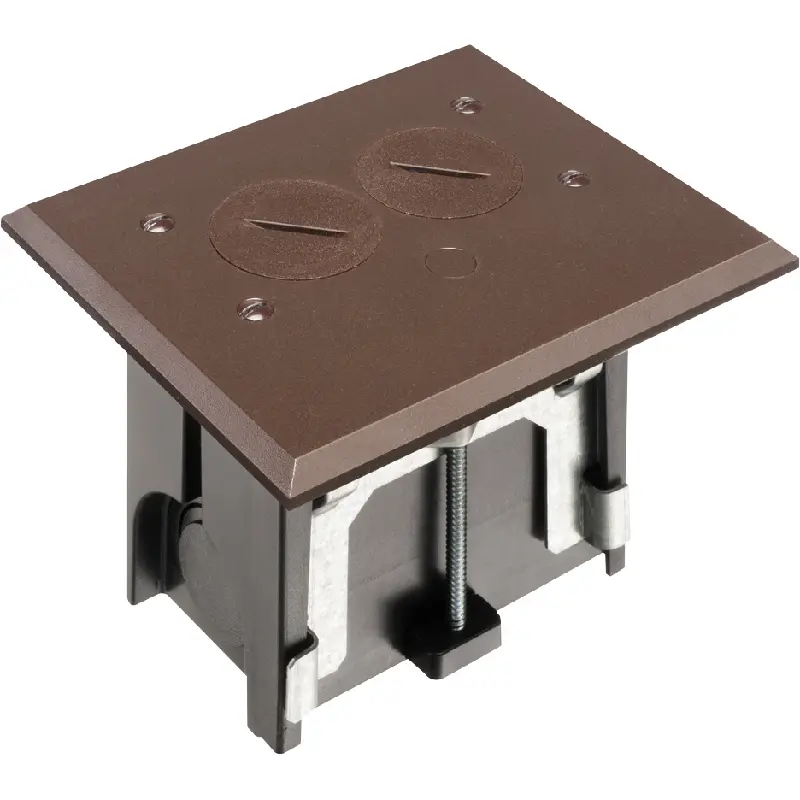 The Arlington FLBA101BR is a 1-gang adjustable floor box kit designed for new construction installations where recessed power is required, such as kitchen islands or home offices.