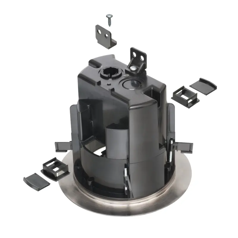 Features an ultra-thin stamped steel flange (~0.067″) and a recessed wiring device that keeps plugs below floor level—minimizing trip hazards
