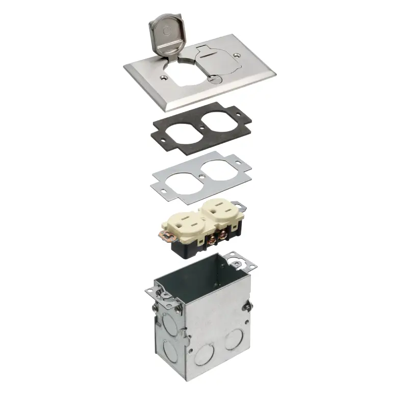 (1)Slotted Cover (1)Low-voltage keystone holder insert (1)Low-voltage blank insert (1)Low Voltage Divider (1)Leveling ring assembly with flange (1)Blank cover with gasket (1)15A Decorator-Style Duplex Receptacle (3)#8 x 5/8" Long Screws |