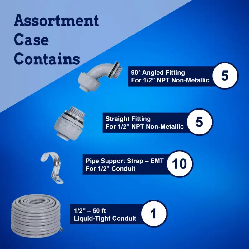 - [Versatile Size & Connector] New Age America’s Liquid Tight Non-Metallic Conduit is Available in a 1/2 Inch Diameter, Extending 50 Feet, Perfect for a Wide Range of Applications. Included in This Kit are Essential Connector Components: 5 Straight Fittings and 5 Angled Fittings, Along With 10 Pipe Support Straps. Each Fitting and Support Strap is Clearly Engraved with Sizes to Prevent Confusion During Installation. This Comprehensive Setup Ensures Easy and Accurate Assembly for All Installations.