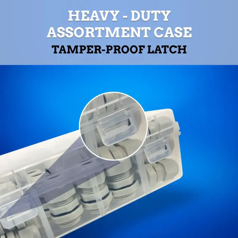 - [Assortment Case] Store Spare NPT Cable Glands in our Heavy-Duty, Convenient, and Easily Accessible Strain Relief Kit from New Age America. Each Cable Gland is designed for Easy Access and Organization, ensuring that you always have the Right Type of Nylon Cord Grip at hand for any Installation or Repair. This Assortment Case allows for Efficient Management of Various Sizes and Types of Cable Glands, making it Essential for maintaining System Integrity and Reliability in any setting.