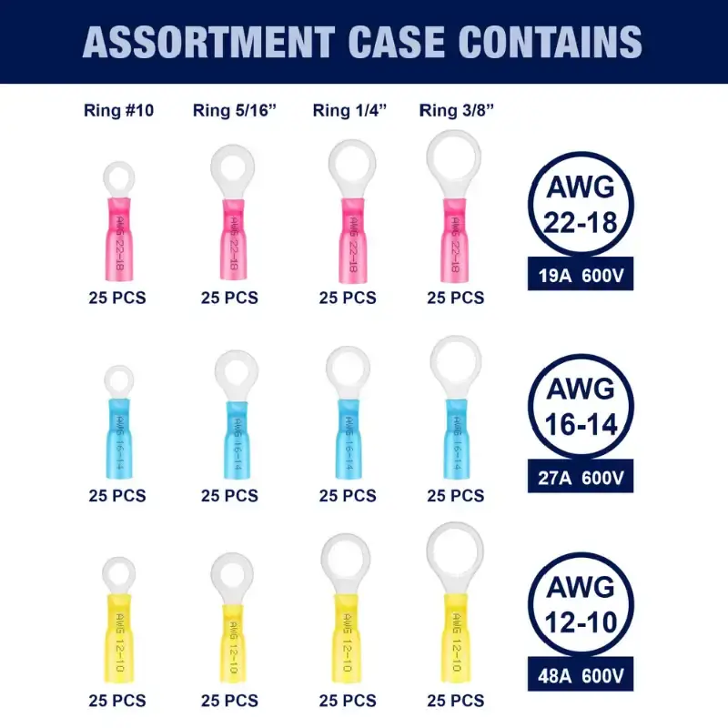 - [Comprehensive Wire Connectors Kit] New Age America’s Heat Shrink Ring Connectors Provide a Perfect Fit for Various Wire Sizes. Each Connector in Our Wire Connectors Kit, Including Crimp Connectors, & Waterproof Wire Connectors, Is Designed for Precise Connections. This Assortment Includes 25 pcs each of AWG 22-18 Ring #10, Ring 1/4″, Ring 5/16″, Ring 3/8″, AWG 16-14 Ring #10, Ring 1/4″, Ring 5/16″, Ring 3/8″, and AWG 12-10 Ring #10, Ring 1/4″, Ring 5/16″, Ring 3/8″. Rated to 48 Amps & 600 Volts