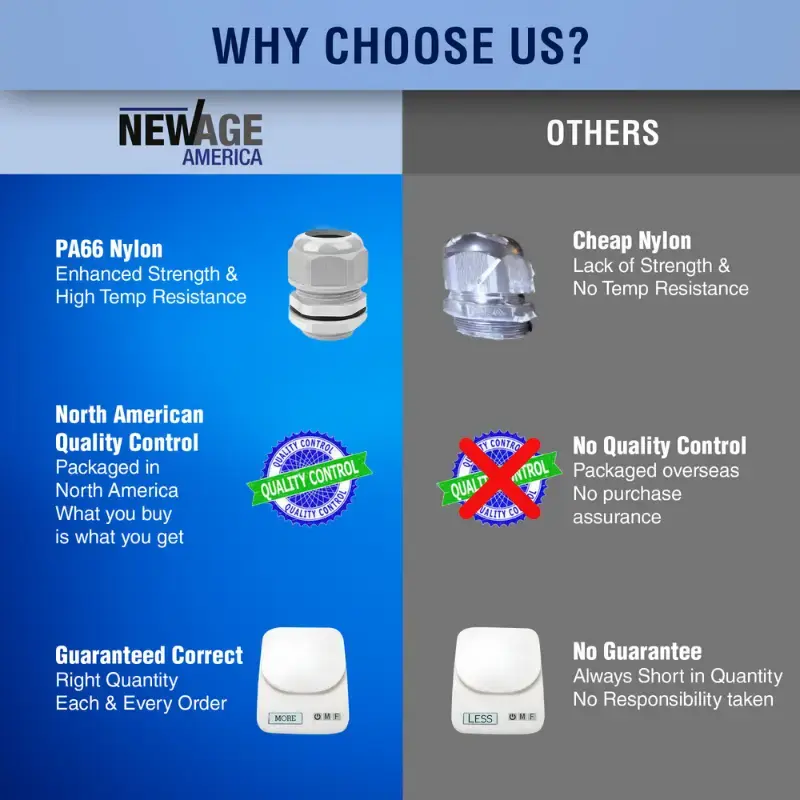 - [Lifetime Warranty] Every NPT Cable Gland from New Age America, equipped with KableLock Technology and part of our Strain Relief Kit, is backed by our Exceptional Lifetime Warranty. These Glands are crafted from High-Quality PA66 Nylon, known for its Superb Durability and Resistance to Abrasion, which is Ideal for Preventing Corrosion and Wear. The Material’s Robustness and the IP68 Rated Waterproofing ensure that these Cable Glands offer Long-Lasting Reliability and Performance in any setting