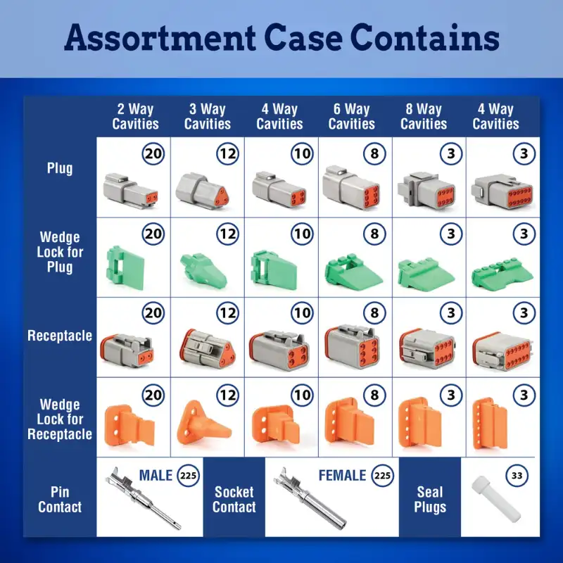 - [Assortment Case] Organize Your Spare Deutsch Equivalent DT Series Connector, Pins, and Sockets Effortlessly in the Heavy-Duty and Convenient Deutsch Connector Assortment Case Provided by New Age America. This Durable Case Ensures Easy Access and Organization of Your Automotive Electrical Connectors, Facilitating Quick Repairs and Installations Whenever Needed. Available in 2, 3, 4, 6, 8, and 12 Pin Configurations, Offering Versatility for Various Wiring Applications