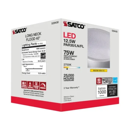 Operating at an economical 12.5 Watts, this Satco PAR30 LED is an energy-efficient lamp that brings you high-quality lighting at an affordable cost. It also features a high CRI of 90 meaning that it will render colors vibrantly.