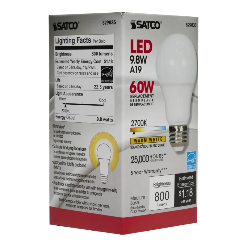 Satco S29835 9.8 Watt; A19 LED; 2700K; Medium base; 220 deg. Beam Angle; 120 Volt