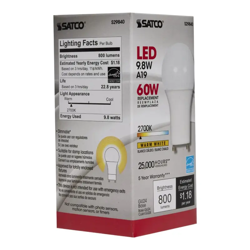 Satco S29840 9.8 Watt; A19 LED; 2700K; GU24 base; 220 deg. Beam Angle; 120 Volt
