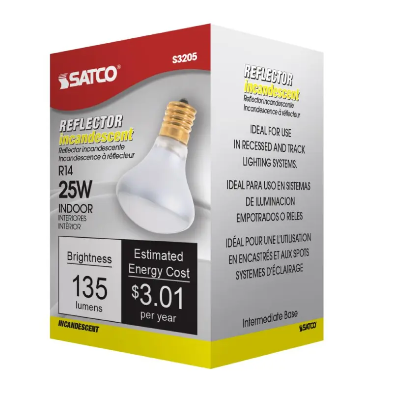 Satco S3205 – 25 Watt R14 Incandescent; Frost; 1500 Average rated hours; 135 Lumens; Intermediate base; 120 Volt