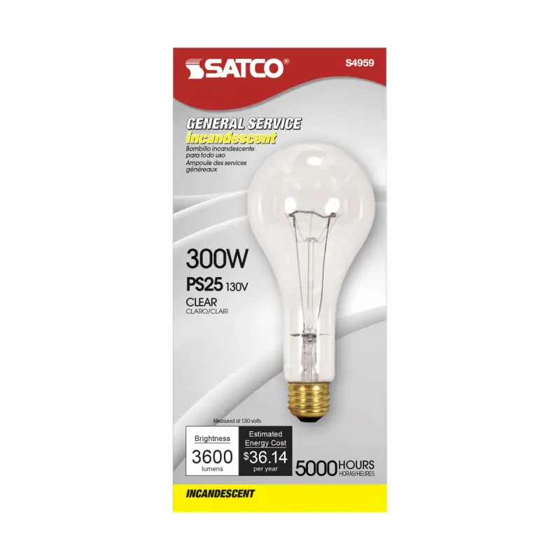 The Satco S4959 is a powerful PS25 incandescent lamp built for general-purpose and high-output lighting. Operating at 300 watts and 130 volts, this clear bulb delivers 3600 lumens of bright, clean light. With an extended average rated life of 5,000 hours and a standard medium base, it offers durability and compatibility for a variety of fixtures in residential, commercial, and industrial settings.