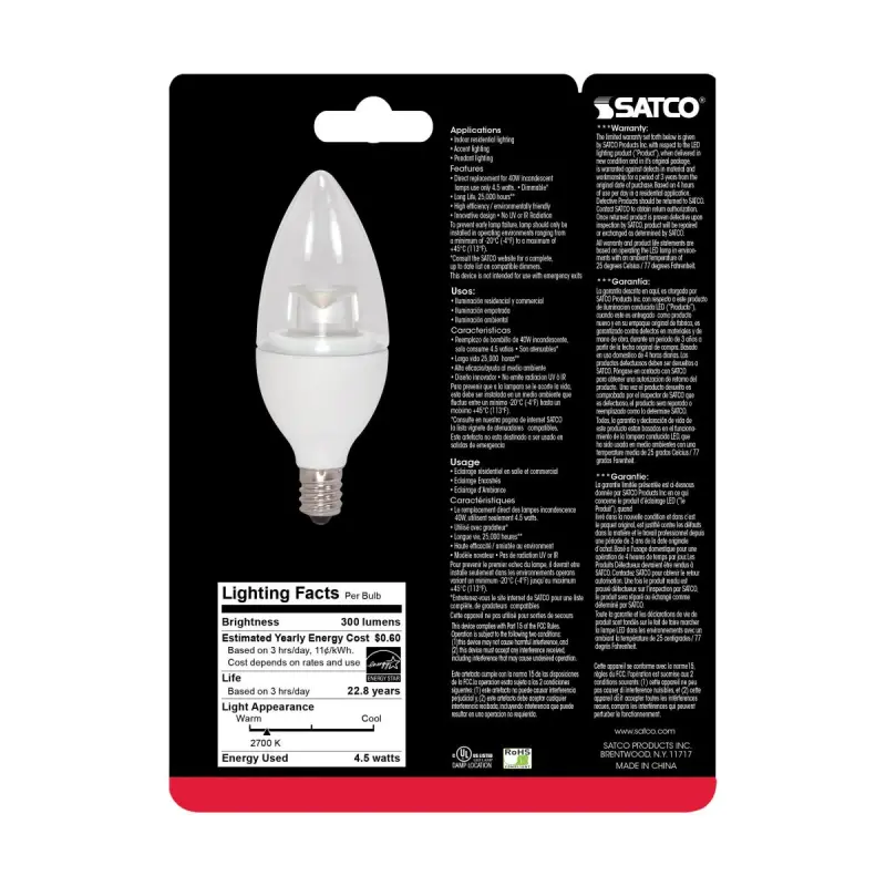 The Satco S8951 B11 LED bulb combines decorative style with modern efficiency, making it an excellent choice for chandeliers, sconces, and accent fixtures. Using just 4.5 watts of power, it delivers a warm 2700K glow that creates a cozy and inviting atmosphere. With its candelabra base and 120V operation, this LED is a reliable replacement for traditional incandescent bulbs, providing long-lasting performance and energy savings.