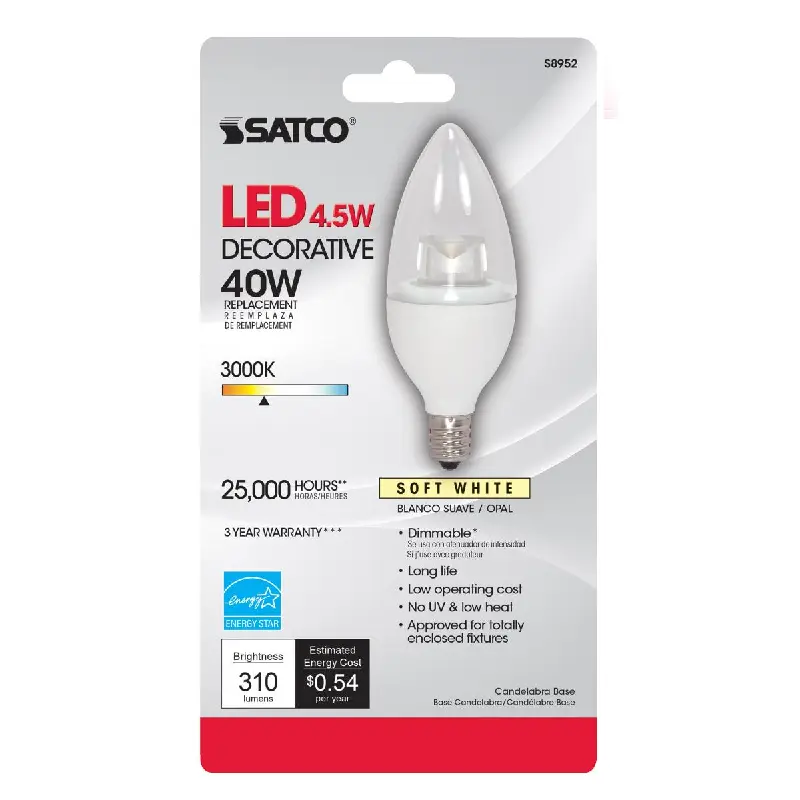 Satco S8952 4.5 Watt; B11 LED; 3000K; Candelabra base; 120 Volt