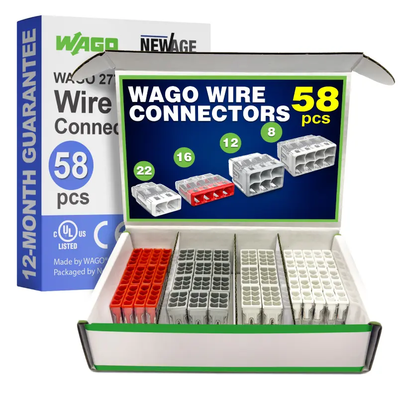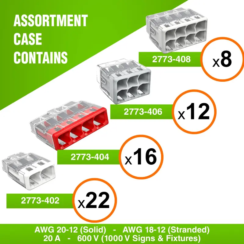- [WAGO Assortment Case] Keep Your WAGO Push-In Wire Connectors Organized and Accessible with Our Convenient Wire Connector Kit. This Kit Features a Selection of the 2773 Series, Including 22 PCS WAGO 2773-402, 16 PCS WAGO 2773-404, 12 PCS WAGO 2773-406, and 8 PCS WAGO 2773-408. Designed for Easy, Tool-Free Connections, it Streamlines Electrical Installations and Includes a Variety of WAGO Electrical Connectors, offering a Solution for All WAGO Terminal Applications. Perfect for Wiring Tasks