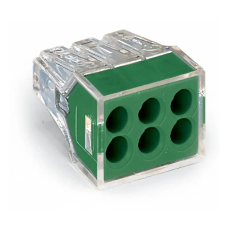 The WAGO 773-116 Wall-Nuts Push Wire Connector for junction boxes provides an immediate solution for use with solid conductors with cross-sections up 4mm². This series with its compact design uses 30% less space than the 273 series. The transparent housing also enables the electrician or installer to see at a glance whether all the conductors have been fully inserted and properly connected.