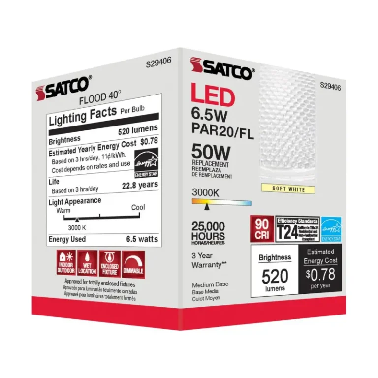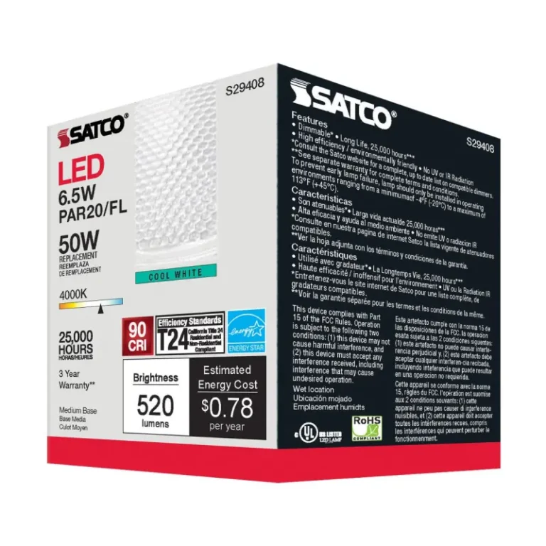 Satco S29408 – 6.5 Watt; PAR20 LED; 4000K; 40 deg. Beam Angle; Medium base; 120 Volt