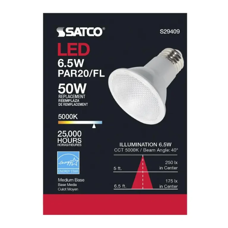 Satco S29409 – 6.5 Watt; PAR20 LED; 5000K; 40 deg. Beam Angle; Medium base; 120 Volt
